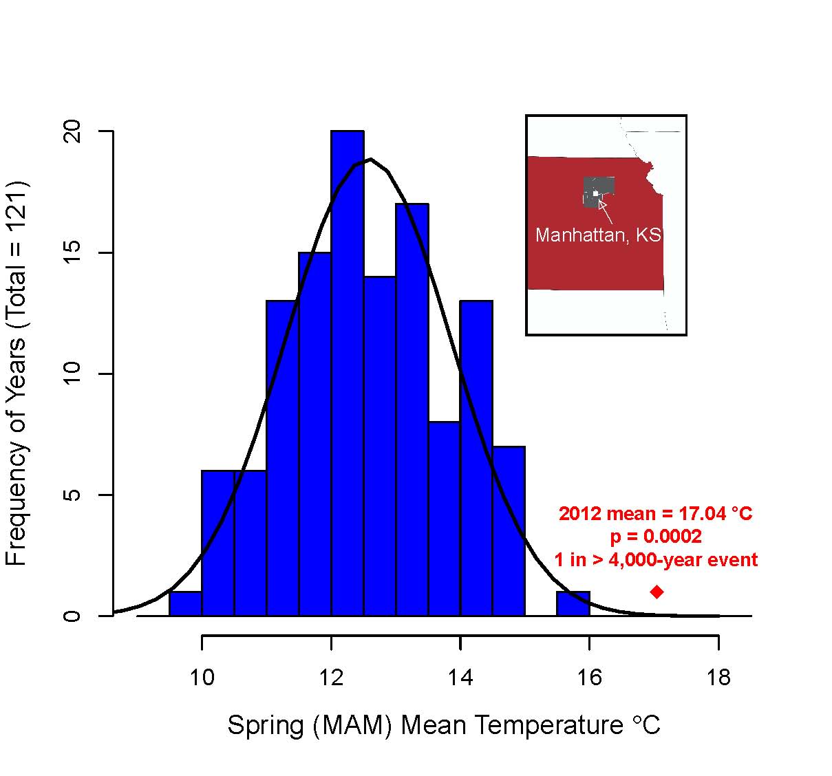 Andrew Freedman at Climate Central writes a lot of superb posts summarizing extreme events. The situation for the lower 48 so far this year is sobering (see here). I plan to post a summary of weather for Manhattan, KS for the first six months of this year with respect to the record back to 1891 in coming days. I produced a graph last month that shows how spring mean temperatures already blew our record out of the water. Below is a normal distribution fit to the Manhattan, Kansas climate record (1891-2011) and the probability of sampling this year (2012) from that distribution.