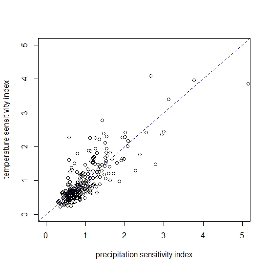 This is pretty cool. The plot below shows our sensitivity indices (standardized) for >250 species plotted against one another with a one-to-one line. I am anxious to figure out if there are any particular functional groups that tend to fall either above or below the line (be more temperature or precipitation responsive). Also, as one moves up and to the right, the mean first flowering day of the year increases.