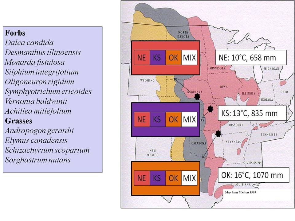 Back during the winter of 2009-2010 I sowed restoration plots that consisted of twelve grassland species at three sites in three states. At each site I sowed the same species and the same weights of live seeds for each species, but I manipulated seed source at the community level. The general design of the experiment is shown in Fig. 1 below.