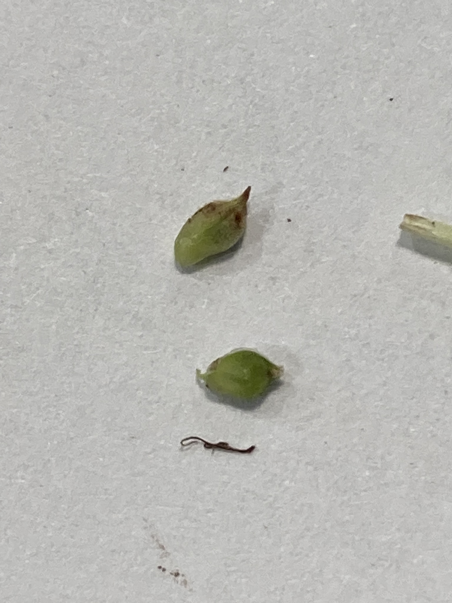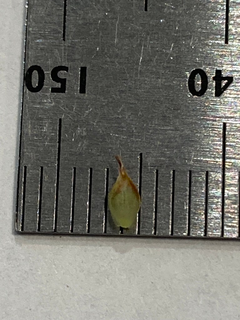 Mature (readily disarticulated) sun sedge perigynium top and Pennsylvania sedge (bottom). Note that this Pennsylvania sedge peryginium was 1.5-1.6mm wide, so perhaps ambiguous or misleading in some keys, but still narrower in measurement with a shorter beak (once any retained stigmas are knocked off).