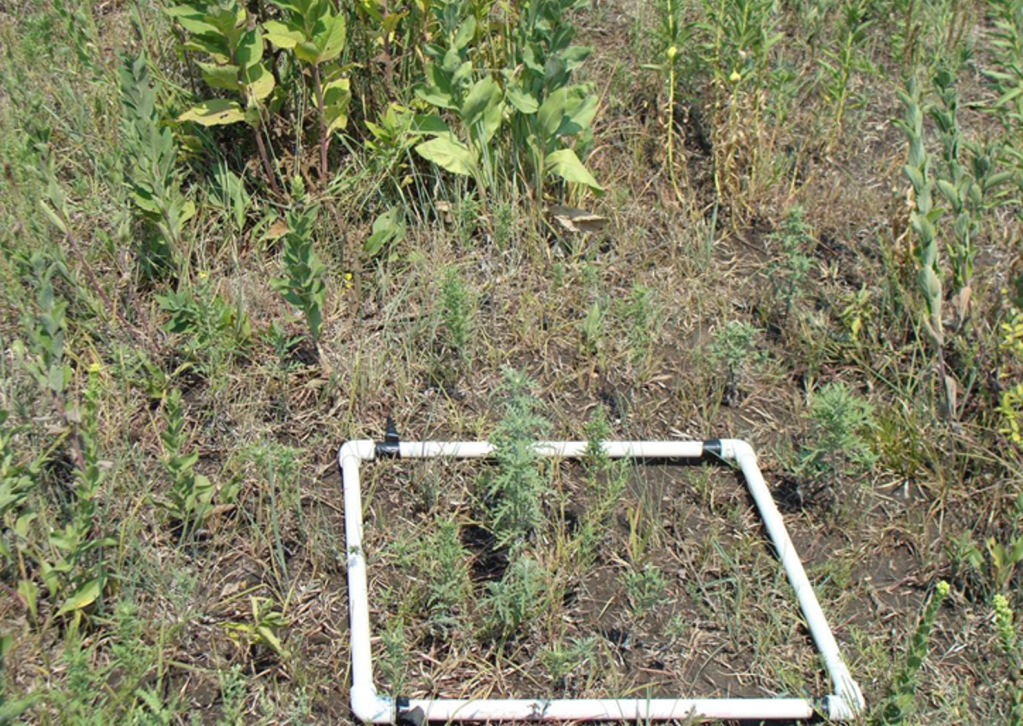 Figure 2: A vegetation sampling quadrat in a bison-grazed, biennially burned watershed at Konza in August. Tall goldenrod (Solidago altissima, C=1), stiff goldenrod (Solidago rigida, C=3), plains ragweed (Ambrosia psilostachya, C=3), hoary vervain (Verbena stricta C=1), and Baldwin’s ironweed (Vernonia baldwinii C=2) are the most prominent forbs in the vicinity, none of which are conservative (Coefficients of conservatism are for Kansas).